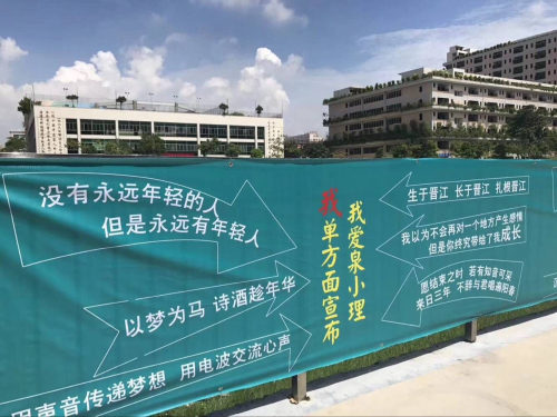 “我单方面宣传 我爱泉小理”、“生于晋江 长于晋江 扎根晋江”、“没有永远年轻的人,但是永远有年轻人”这些随处可见的特色横幅、创意十足的文化墙,幽默有趣又不失正能量,还有具学校和晋江特色的明信片可供家长、学生写好寄出,让新生消除陌生感,有家的温暖。