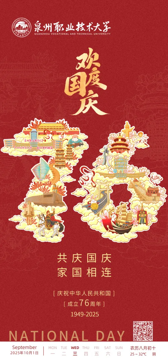 10月1日清晨,泉州职业技术大学师生代表齐聚国旗下,举行庆祝中华人民共和国成立76周年升旗仪式。校党委书记傅志雄、校党委副书记/副校长蔡金佩等校领导,各学院、书院党组织书记,各部门负责人,全体辅导员与学生代表共同见证五星红旗冉冉升起,以青春之名向祖国深情告白。