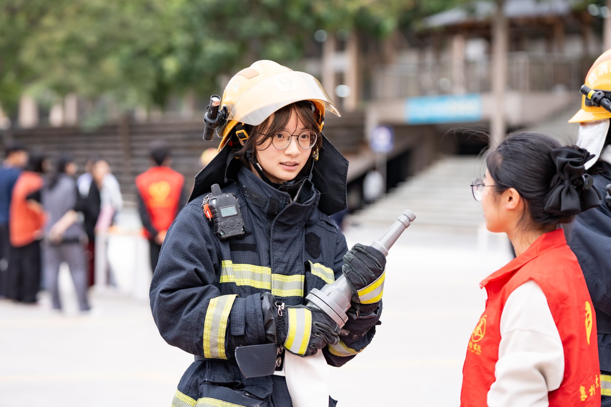 ▲ 同学们体验全套消防防护装备穿戴,并聆听专业人员讲解水枪装配和使用方式