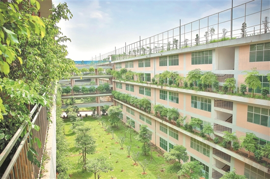走在泉州理工学院校园内,处处可见绿意,最引人注意的是那栋7层楼的教学主楼,墙上、屋顶和天井都种植小树,各种树木共计3000多棵。你不用担心树根扎进水泥,因为这些树木经过实验,长到一定高度就不再长。一位老师赞叹道“我们就像在森林里办公生活一样,空气很清新”。