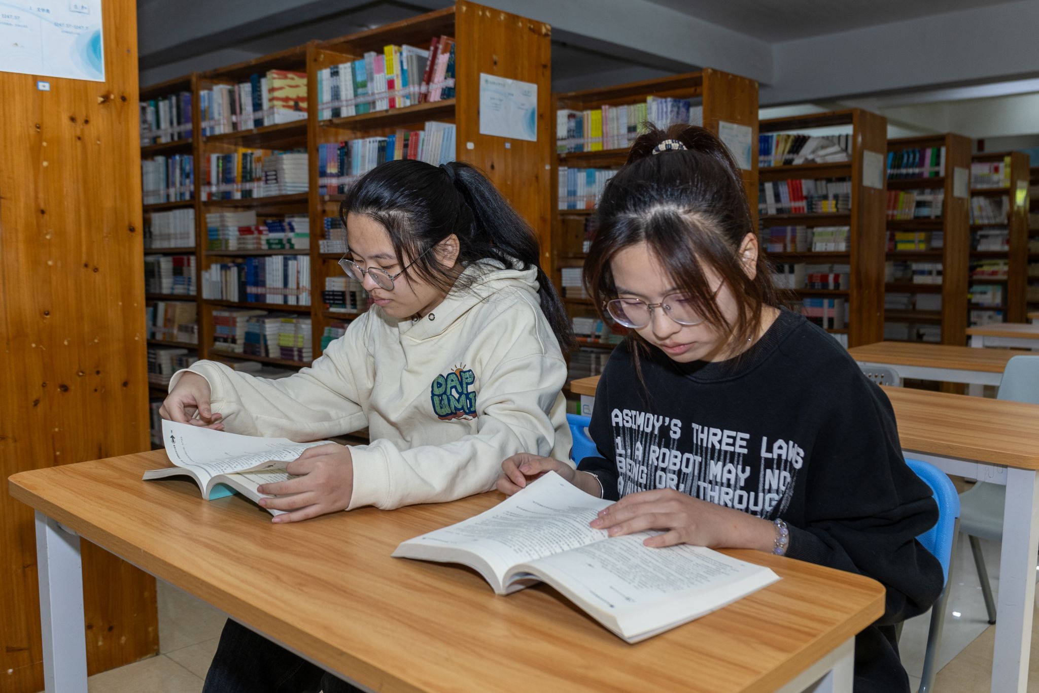 ▲ 李雅雯和李雅珊在图书馆学习交流