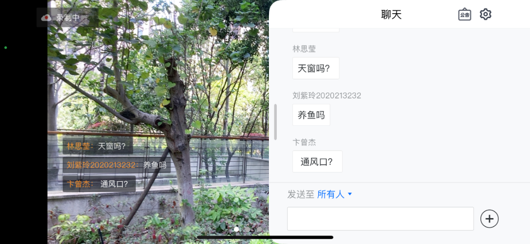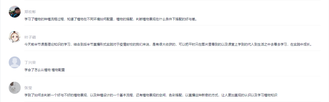 “开阔的阳光草坪可以营造出活力的开敞空间,密植的林荫小道可以营造出宁静的密闭空间,由植物半围合的木平台可以营造出休闲的半开敞空间。”陈老师拎着直播手机,边走边讲,同学们则在后台不断留言点评。