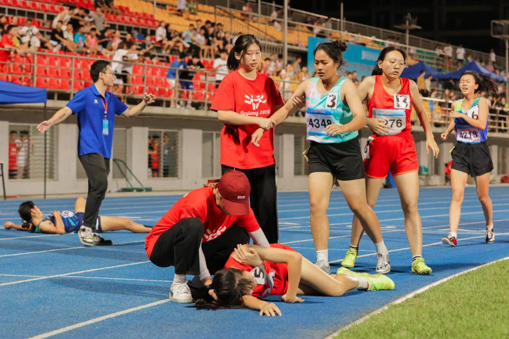 比赛期间,2020级休闲体育3班的张珅玮每天都在赛后控制中心忙碌。他负责引导运动员进出场,配合裁判员控制好比赛流程,还要适时安抚好运动员的情绪。其中,最具挑战的是3000米、5000米长跑赛事。令他印象深刻的是,在一场5000米比赛,一位男生摔倒后,又急忙爬起来,当时,人已神志不清、走路摇摇晃晃,嘴里却兴奋喊着“我还能跑……”张珅玮见状急忙上前,搀扶住男生,并拿矿泉水往其头上浇,帮其进行物理降温,还不停地安抚,让运动员冷静下来,确保人员安全和赛场秩序。