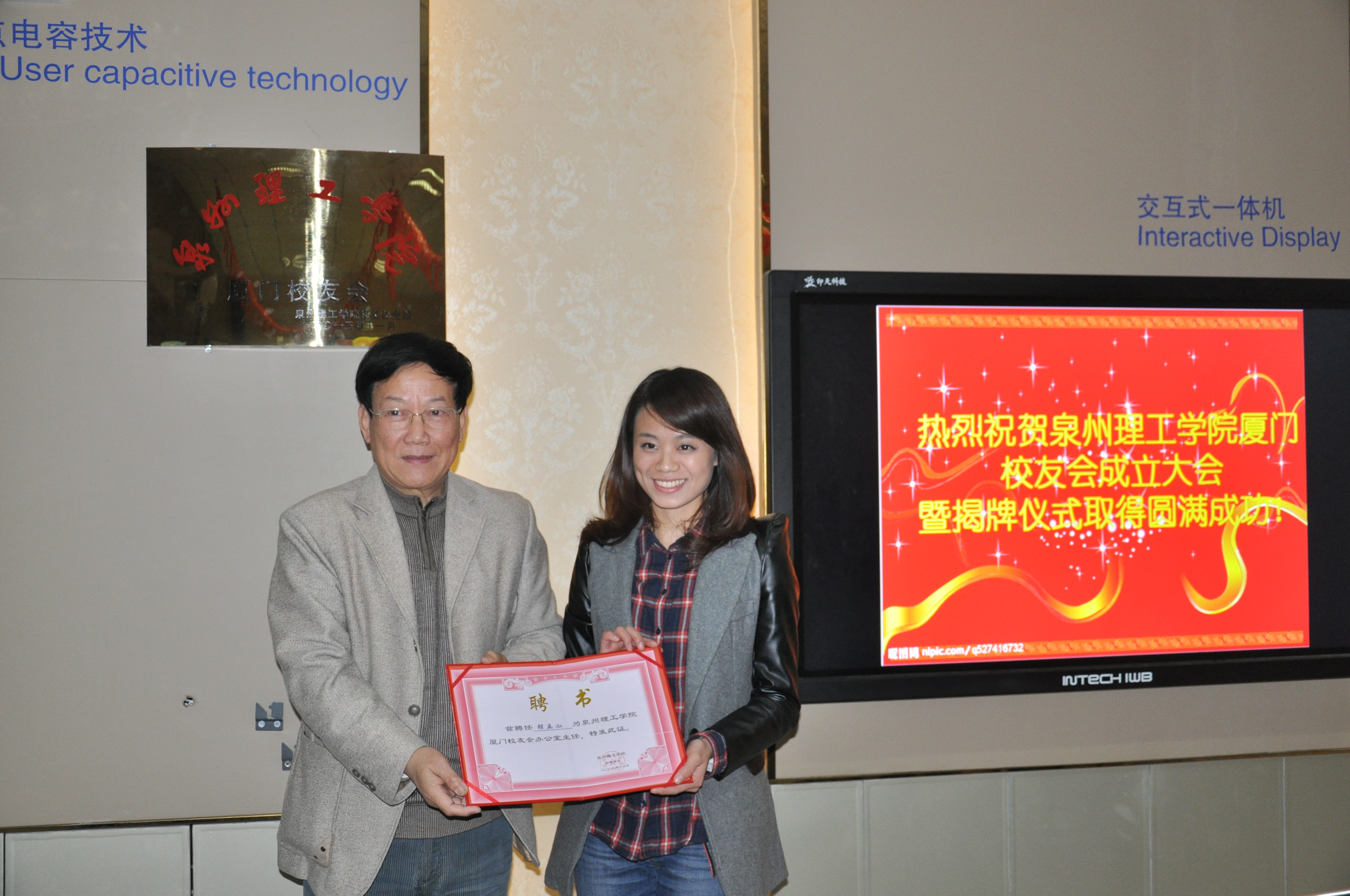 20131229日下午,厦门校友代表汇聚一堂,于厦门市软件园二期望海路45号一楼会议厅举行“泉州理工学院厦门校友会成立大会暨揭牌仪式”,我校名誉校长、校友总会会长苏志明、校党委宣传部长、校友总会秘书长林文艺到会祝贺,并为厦门校友会揭牌,向二十多名厦门校友会理事成员颁发聘书。